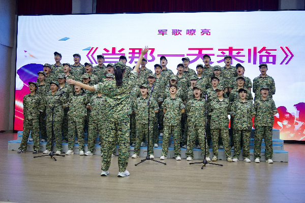 嘹亮歌声整齐划一,字句里满是青春朝气与军训魄力,激昂旋律回荡全场,唱出了军歌的味道,每一声合唱都超有感染力,这才是少年该有的热血模样!