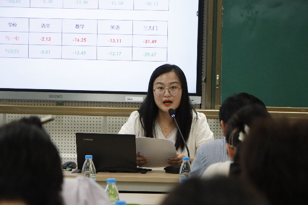 教学处副主任王任怡针对上学期期末语数外区统考的考试情况,分别从横向和纵向进行详细对比,分析出我校的优势与不足;同时根据八个班级的三门均分、离差,总结出需要改进的改进策略与方法,为任课教师接下来的教学工作提供了明确的指引方向。