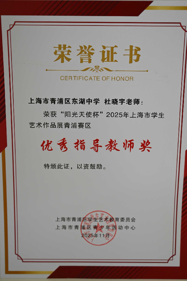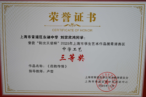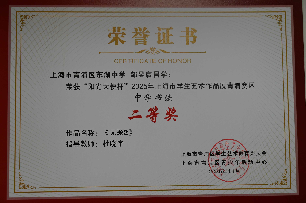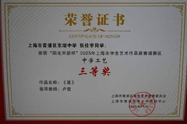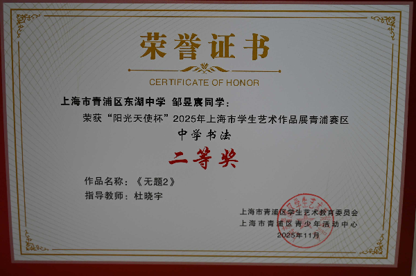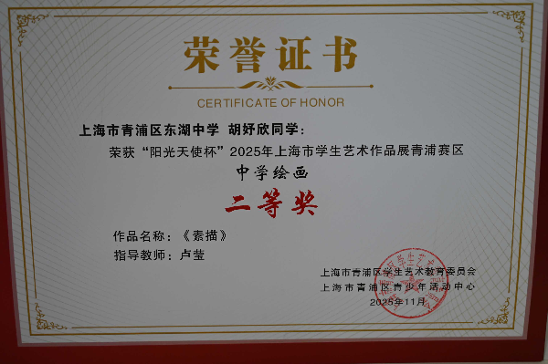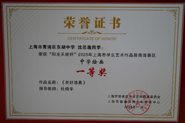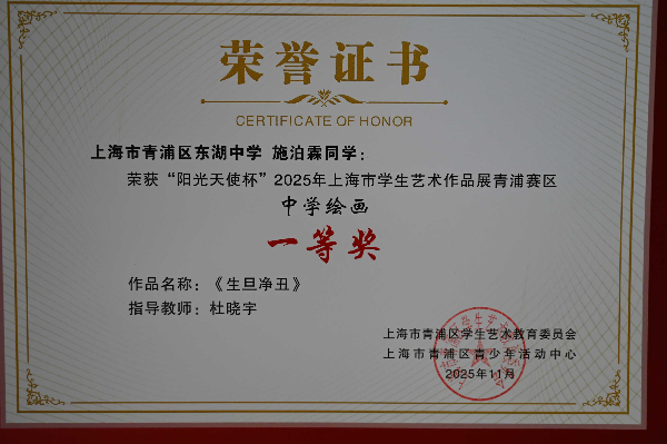 近日,“阳光天使杯”上海市学生艺术作品展青浦赛区评审结果正式揭晓,东湖学子深耕艺海、捷报频传,在绘画、书法、工艺三大类别中,以笔墨抒怀、以匠心创作,充分彰显了学校美育教育的扎实成效与学子们的卓越艺术素养。