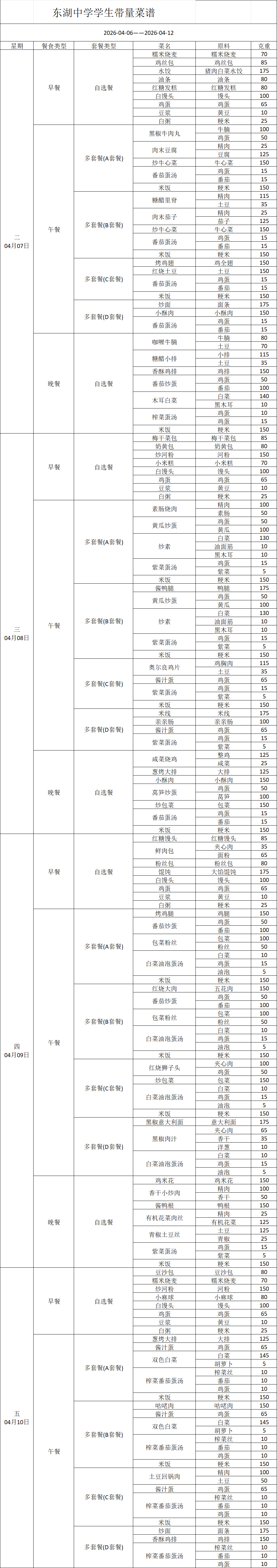 东湖中学学生一周菜单20260407-20260412