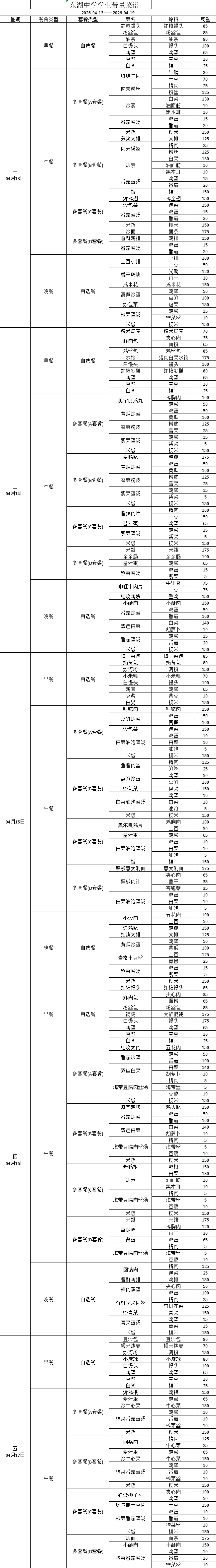 东湖中学学生一周菜单20260413-20260419